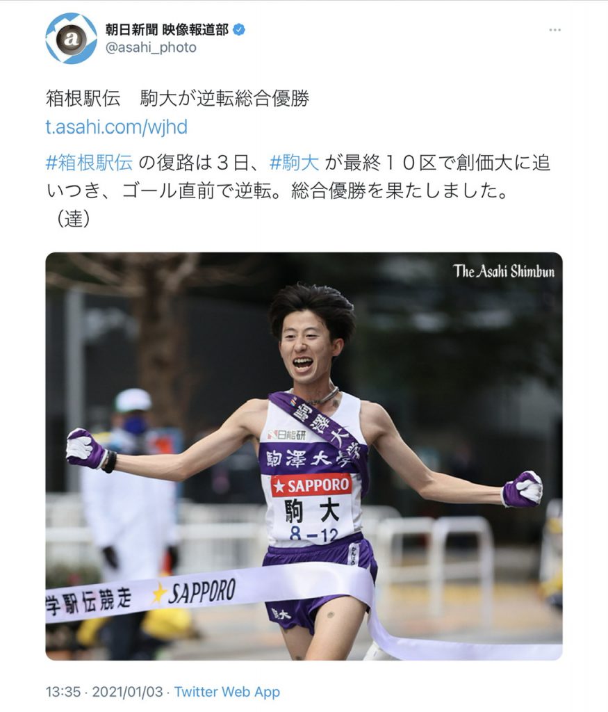 箱根駅伝は往路までは創価大だったが、結局は逆転で駒澤大の優勝となった。