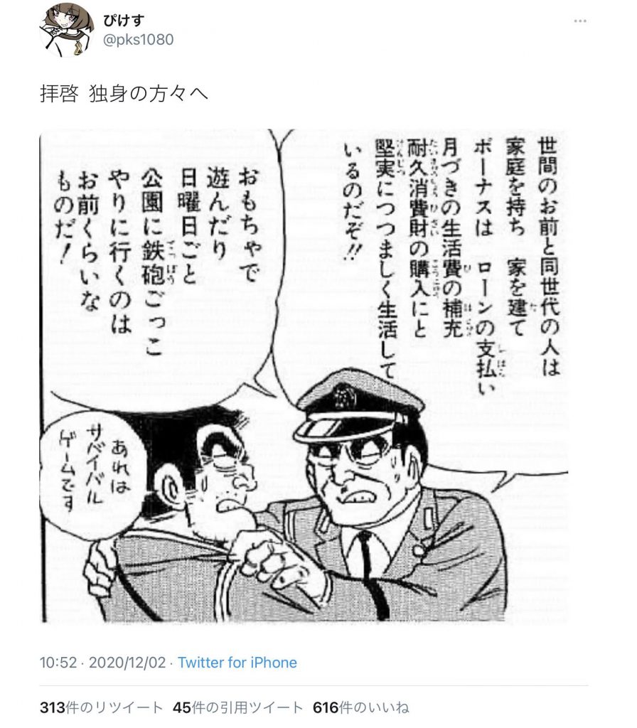 ・・・で、反応はと言えば案の定「そうだ。結婚してまともに生きなきゃ」なんてものは皆無で、「いい年して遊んでて悪いか」「結婚して子育てしてつつましく生きてる人はえらいねー」みたいな反応だった。
