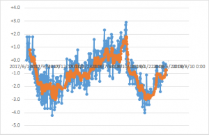 これを「翌日の法則」と名付けようか。体重は-0.6kg(前回比+1.0kg)、10回平均で-1.4kg(前回比±0.0kg)と、かなり増えている。