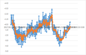 体重は+0.4kg(前回比+0.4kg)で、10回平均は-0.5kg(前回比+0.1kg)となってしまった。