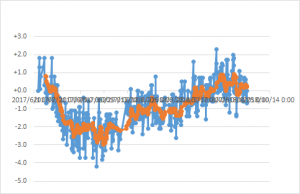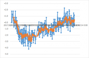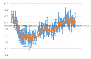 この体重の変動の大きさは何なんだろう?ともかくも平均としては下降傾向なので、それを素直に喜ぶことにしたい。