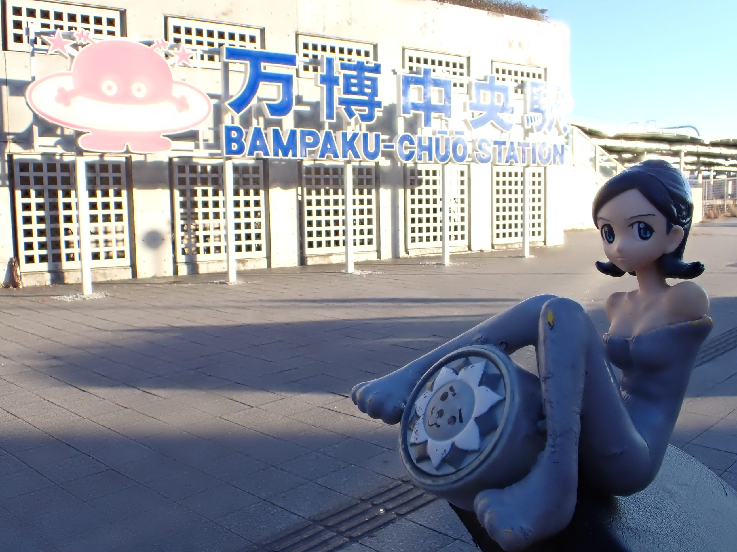 駅の前に「万博中央駅」の駅名標があるので、それを撮ることにする。