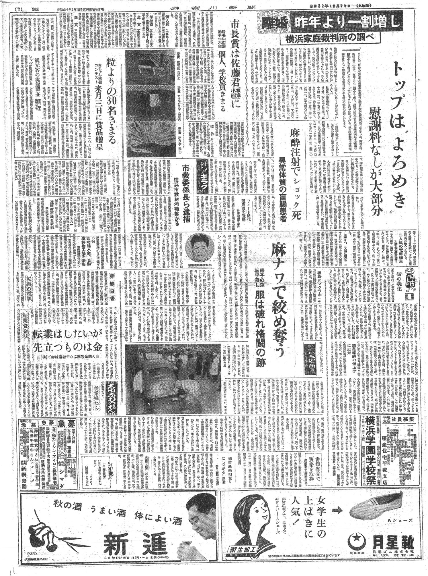 紙面下部の広告欄には、月星靴の学生靴や日本酒の広告が並び、当時の人々の暮らしの一端を伝えています。