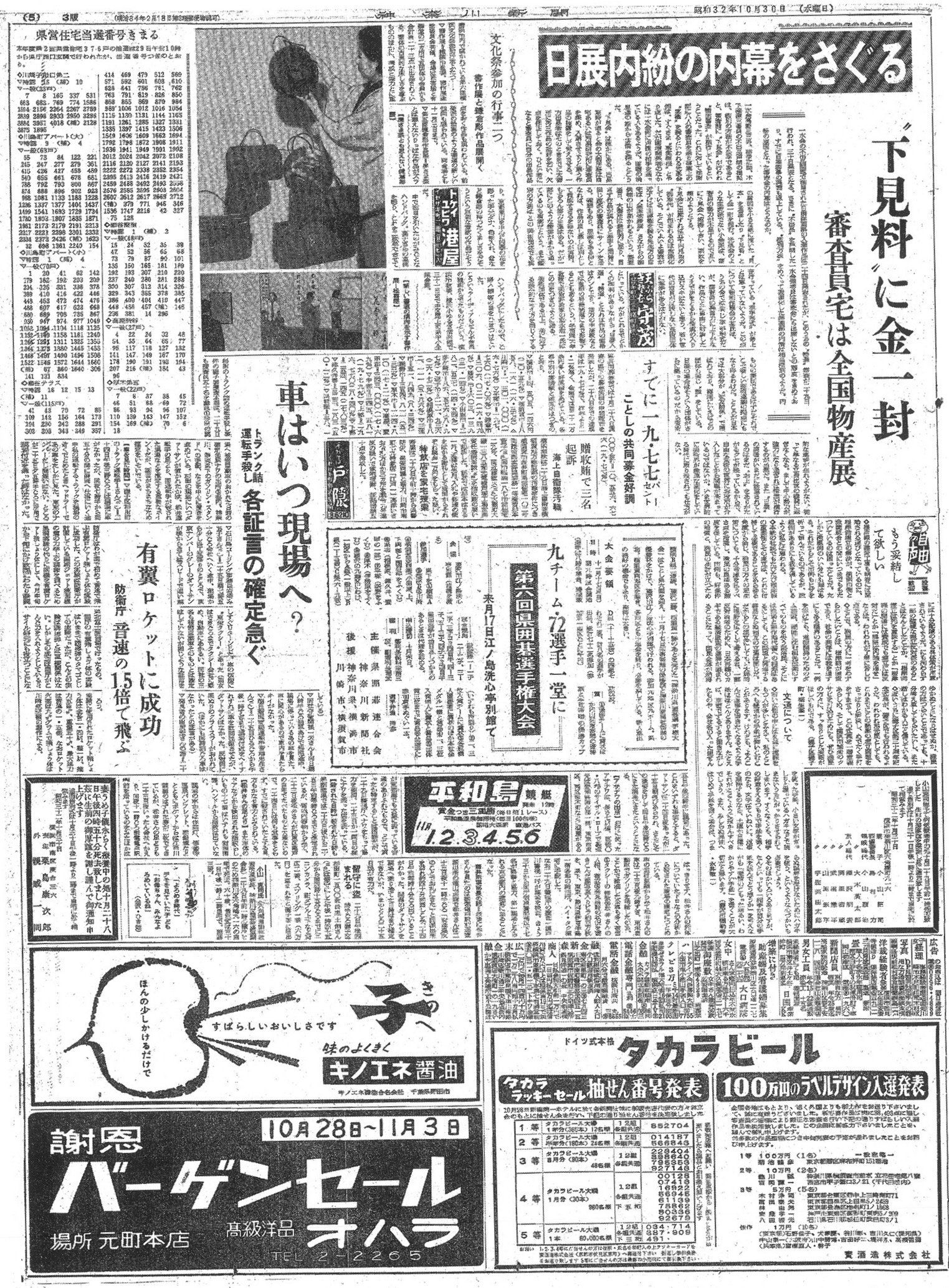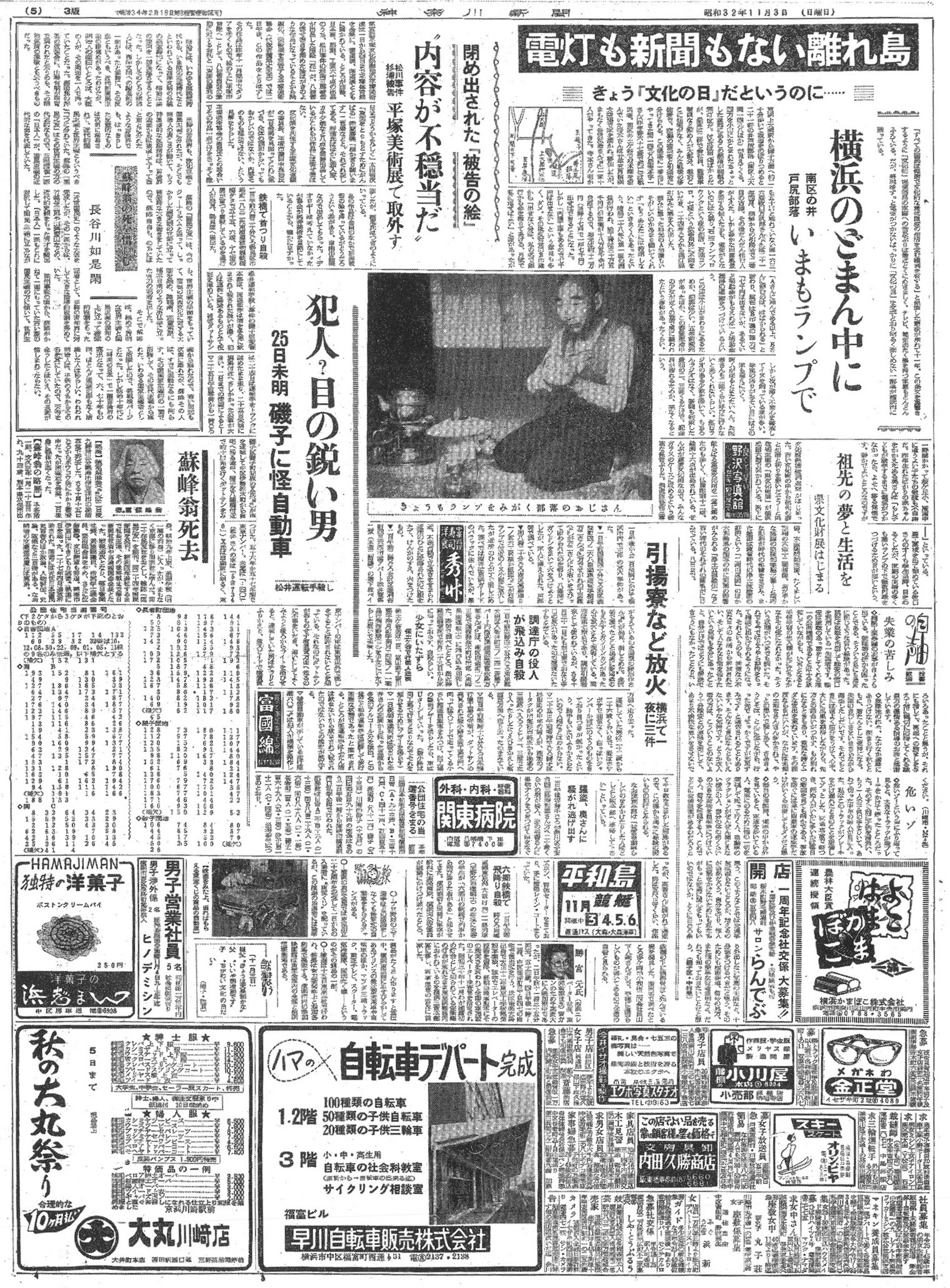 同じ紙面では、当時の社会情勢を伝える記事として、横浜市上大岡の「ごみの中」にありながら今なおランプ生活を続ける集落のルポルタージュが掲載されており、文化の日を前に近代化から取り残された地域の姿を浮き彫りにしています。また、平塚の美術展で刑事被告人が描いた不穏当な絵が撤去される騒動や、市内で相次いだ放火事件、防衛庁による有翼ロケットの飛行成功など、戦後復興から高度経済成長へと向かう激動の世相が多角的に報じられています。広告欄には自転車デパートの完成や秋の特売の告知が並び、当時の人々の消費意欲と日常生活の一端を伝えています。