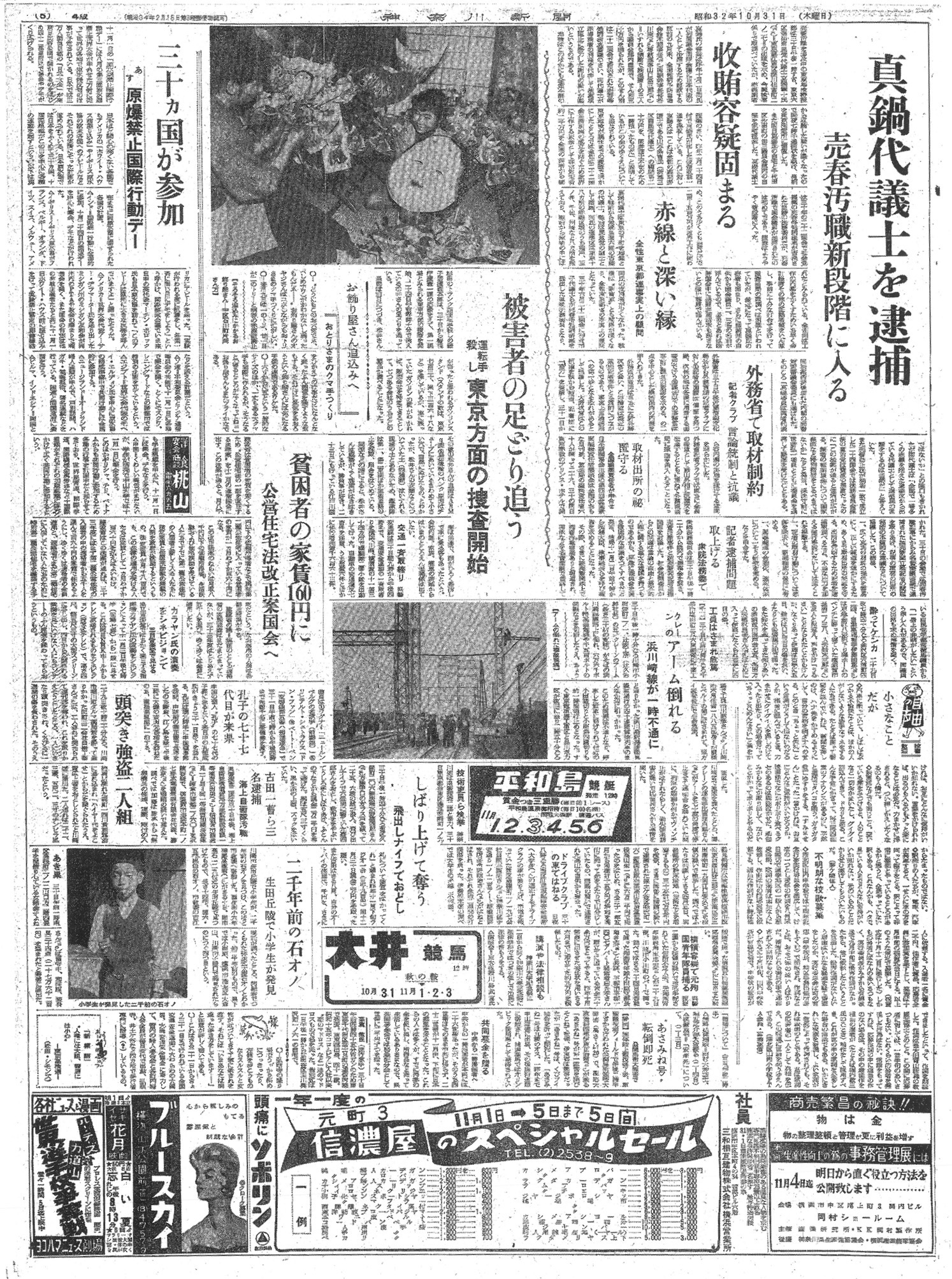 同じ紙面では、当時の社会の動きを象徴するニュースも多数掲載されています。政治面では、売春汚職事件に関連して真鍋代議士が逮捕されるという大きな不祥事が報じられ、翌年の売春防止法施行を控えた世情を反映しています。社会面では、貧困層向けの家賃を160円に抑える公営住宅法の改正案や、30カ国が参加する原爆禁止国際行動デーの動きが伝えられており、戦後復興と平和への模索が続いていたことが伺えます。また、工事現場でのアーム転倒事故や「おとりさまのクマ手づくり」といった季節の話題も並び、複雑な時代相を映し出しています。