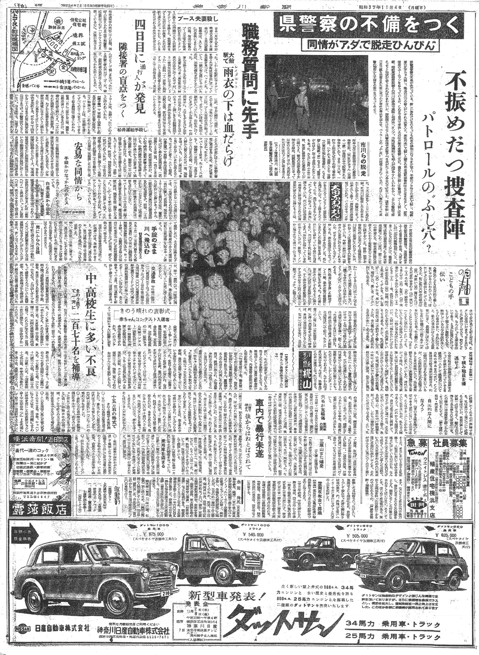 同じ紙面には当時の社会相を伝えるニュースも豊富に掲載されています。日産自動車による新型ダットサン1000の発表広告では、当時の価格や最新のデザインが大きく紹介されており、高度経済成長へと向かう自動車産業の活気が伝わります。その一方で、中・高校生1,270名が補導されたという記事や、赤ちゃんコンテストの話題、そして依然として続くロケット実験の報道など、戦後の混乱から成長へと突き進む当時の複雑な世相が多角的に記録されています。