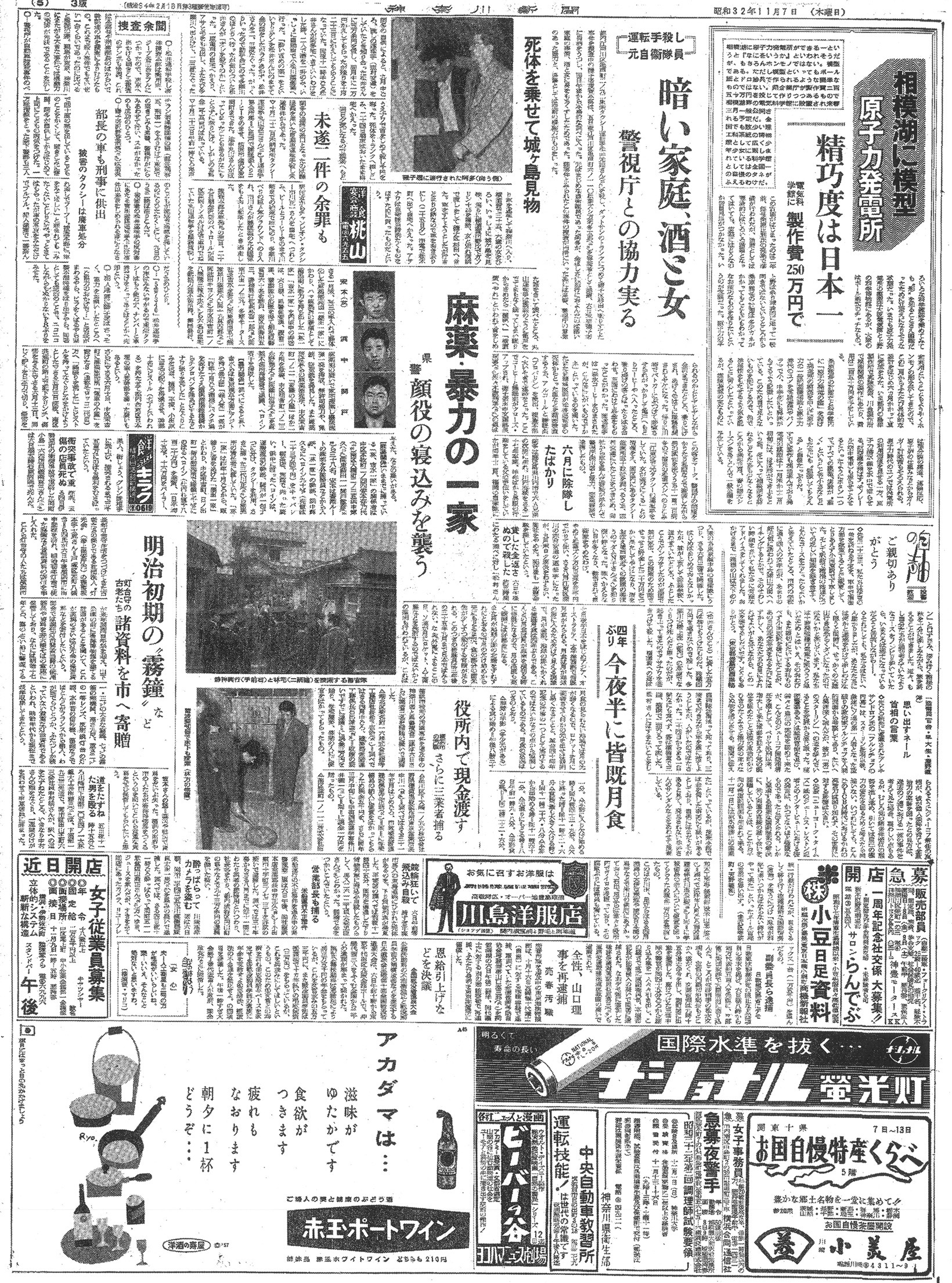 同じ紙面には、当時の社会や科学の動向を伝える興味深いニュースが掲載されています。科学面では、相模湖に模型の原子力発電所が設置され、その精巧度が日本一であると報じられており、原子力利用への期待が高まっていた時代相が伺えます。また、四年ぶりに今夜半から見られる皆既月食の話題や、明治初期の「霧鐘」などの歴史的資料が市へ寄贈されたニュース、役所内での現金盗難事件で三業者が捕まった記事などが並んでいます。さらに、麻薬や暴力を用いる「顔役」の一家が寝込みを襲われるという物騒な事件も報じられており、戦後の混乱が残る社会の一面を映し出しています。