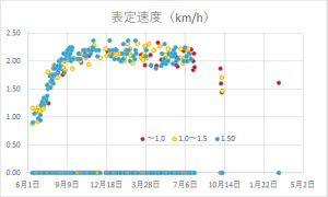 再開第1回目は、13分で0.35km泳ぎ、表定時速は1.62km/hであった。