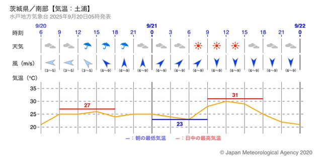 2025年9月20日(土)のつくば市の天気予報: