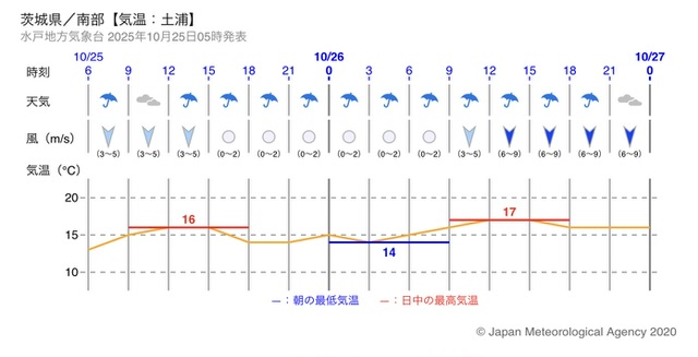 今日はつくばでは朝はよく晴れて、気温は17度前後から穏やかに上がっていきます。昼には雲が広がりはじめ、午後は曇りがちの空になりますが、雨の心配はほとんどありません。最高気温は26度くらいで、日中は少し蒸し暑さを感じるでしょう。夕方以降は雲が多いまま夜を迎え、気温は22度前後まで下がります。濃い霧が朝のうちは残る見込みなので、車の運転などには注意が必要です。