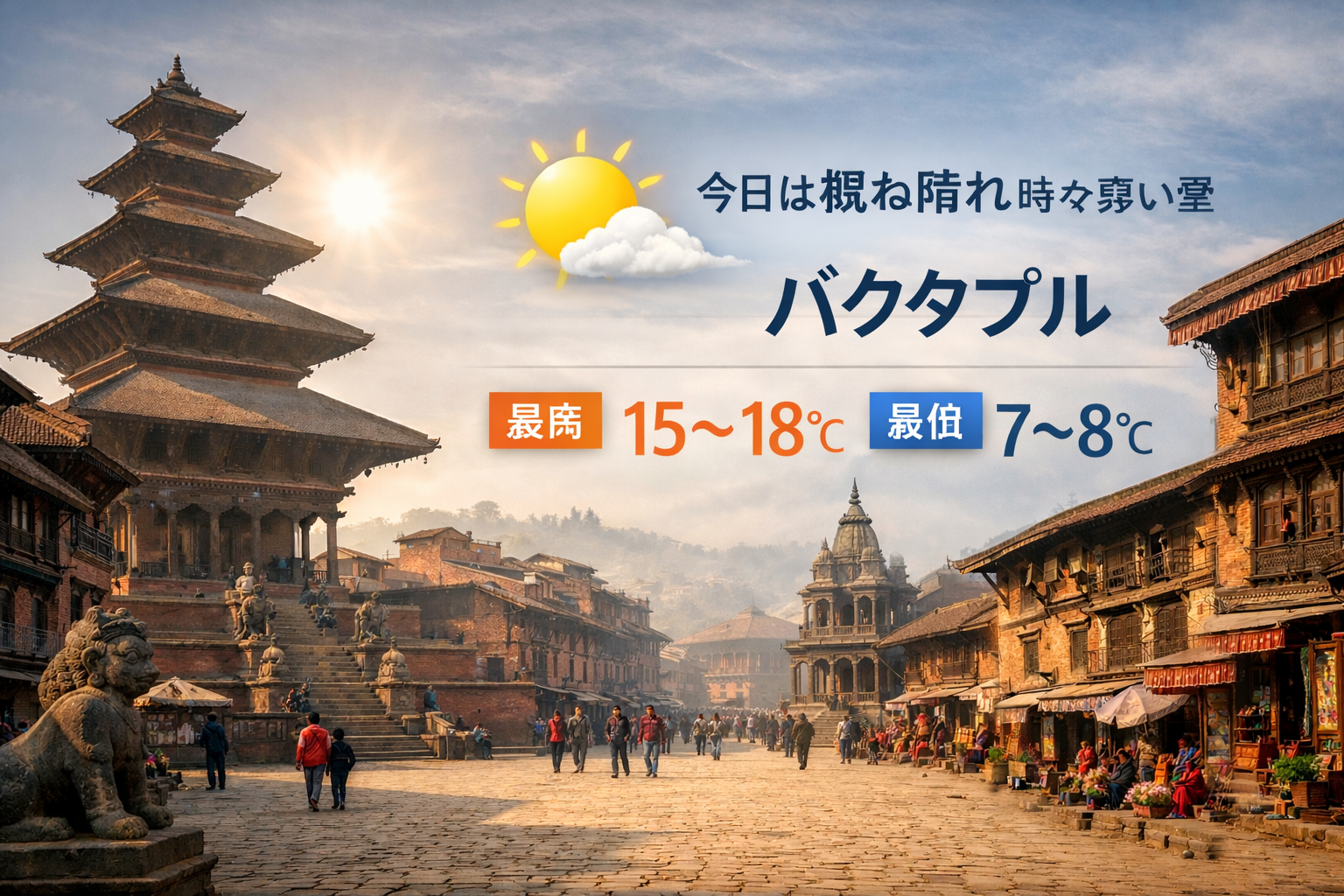 今日のバクタプルは、概ね晴れて穏やかな天気になる見込みです。日中は薄い雲がかかる時間帯もありますが、雨の心配はほとんどありません。気温は昼間で15〜18度前後まで上がり、朝晩は冷え込んで7〜8度前後まで下がります。風は弱く、日差しがある時間帯は比較的過ごしやすいものの、日陰や朝夕は肌寒く感じられそうです。観光や街歩きには概ね良い一日になりそうですが、朝晩用に軽く羽織るものがあると安心です。