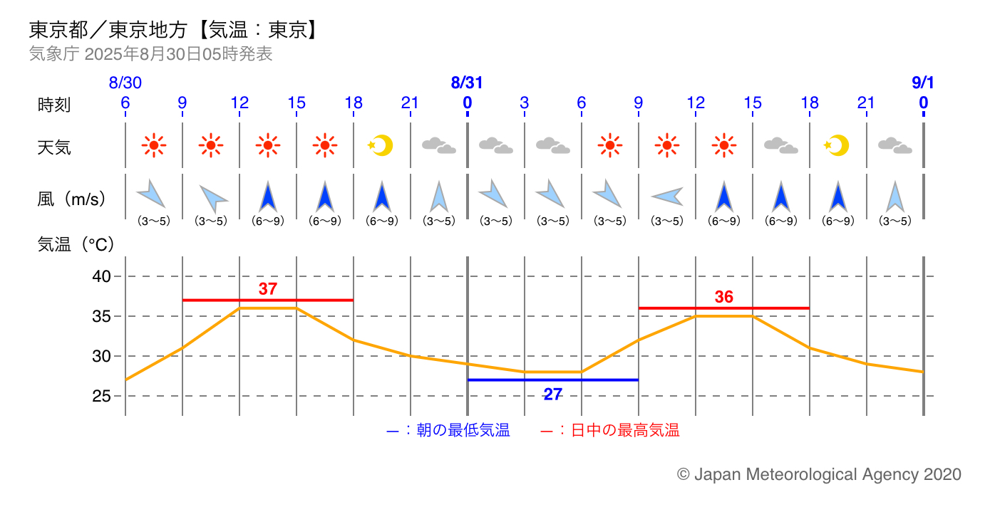 そして、東京駅の1時間ごとの気温の動きを見ると、午前8時には約30℃、午後2時には38℃と最高に達し、その後も35℃前後で推移する予想です 。