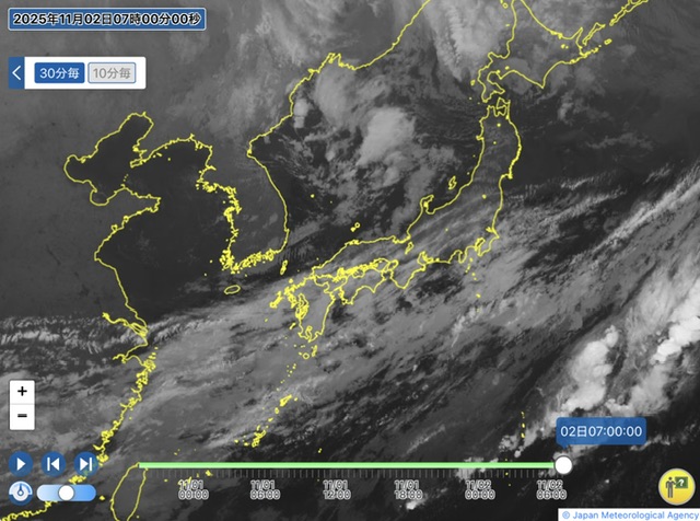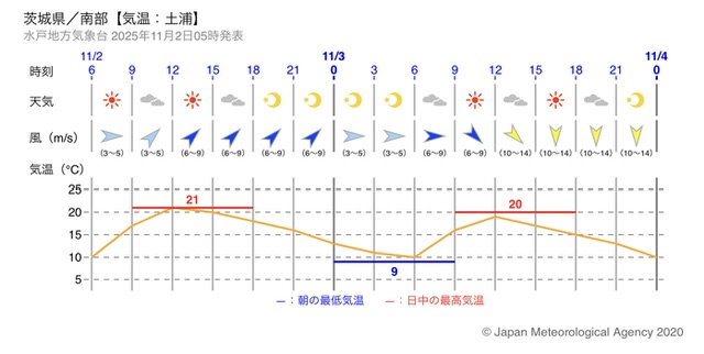 今日(11月2日)のつくばは、朝の段階では一日を通して曇りがちで、午後になってようやく晴れ間が出るだろうと予測されていました。気温は午前中から穏やかに上がり、最高気温は20度前後になる見込みで、風も弱く過ごしやすい一日と見られていました。実際にも昼過ぎまでは雲が多く、夕方にかけて次第に空が明るくなってきています。夜は気温がぐっと下がり、12〜13度程度まで冷え込む見込みです。日中は上着がいらないくらいですが、夕方以降は肌寒くなるので、軽いコートやストールがあると安心です。
