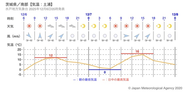 12月6日のつくばの天気は、朝から雲が広がりやすく、日中もすっきりしない空模様が続きそうです。昼過ぎには一時的に日差しが出る時間帯もありますが、概ね曇りベースの一日になります。気温は朝がやや冷え込み、日中は12℃前後まで上がるものの体感はひんやりしたままです。風も弱く、どちらかと言えば静かな冬の空気に包まれそうです。夕方以降は再び冷え込みが強まり、帰る頃にはしっかり寒さを感じるでしょう。
