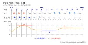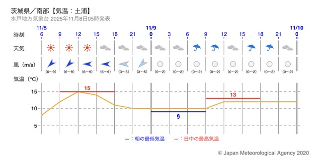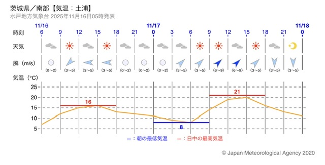 今日はつくばは朝から晴れていて、昼にかけては青空が広がる見込みです。気温は昼過ぎにかけて15〜16度まで上がりますが、夕方からは雲が増えて夜には再び冷え込みます。夜の気温は11度前後まで下がり、放射冷却が強まって霜が降りるおそれがあります。風は弱く、日中は穏やかな秋晴れです。
