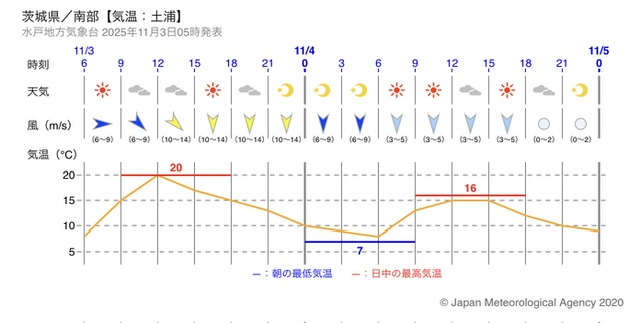 今日(2025年11月3日)のつくば市は、朝から晴れの予想です。最高気温は 20℃、最低気温は 9℃ 付近まで下がる見込みです。